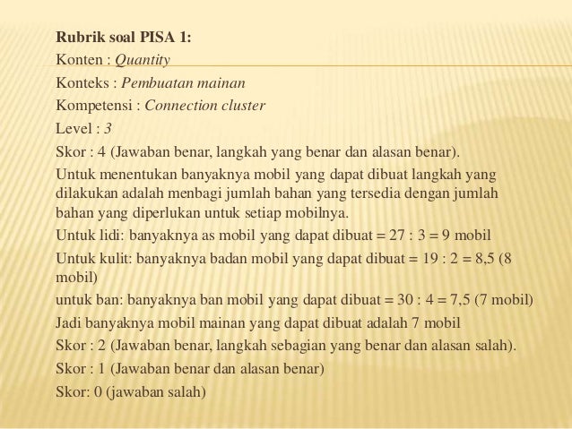 Contoh Soal Pisa Timss Dan Open Ended 3no71mydr3ld from idoc.pub Seharusnya sosialisai bentuk soal pisa ini dilakukan secara luring, karena keadaan yang belum membaik akibat covid 19. Menggosok gigi apakah dengan menggosok gigi semakin lama dan semakin keras gigi kita akan semakin bersih? Mengevaluasi argumen ilmiah dan bukti dari berbagai sumber. Apel seorang petani menannam pohon apel dalam pola persegi. Eva evaluasi pembelajaran tugas soal pisa, timss dan open ended. Jika anda tidak menemukan info mengenai contoh soal pisa bahasa inggris di bawah ini, maka kami sarankan anda untuk mencoba atau mencari hasil pencarian lainnya di www.google.co.id. Karakteristik, level, dan sample soal karakteristik karakteristik soal dalam pisa test. 10:16 am pisa 19 comments.
