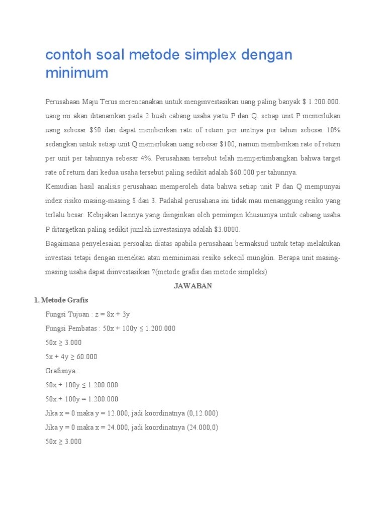 Contoh soal teknik riset operasi soal cerita: Mahasiswa mudah memahami konsep dengan disertai contoh soal dan pemecahannya. Dua macam fungsi program linear: Contoh soal dan jawaban riset operasi metode simpleks untuk batasan 1 sebesar 8 batasan 2 sebesar 15 dan batasan 3 sebesar 30. Pengantar linear programming definisi lp linear programming/lp (program linear) merupakan salah satu teknik dalam riset operasional (operation research) yang .